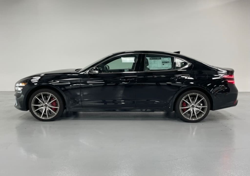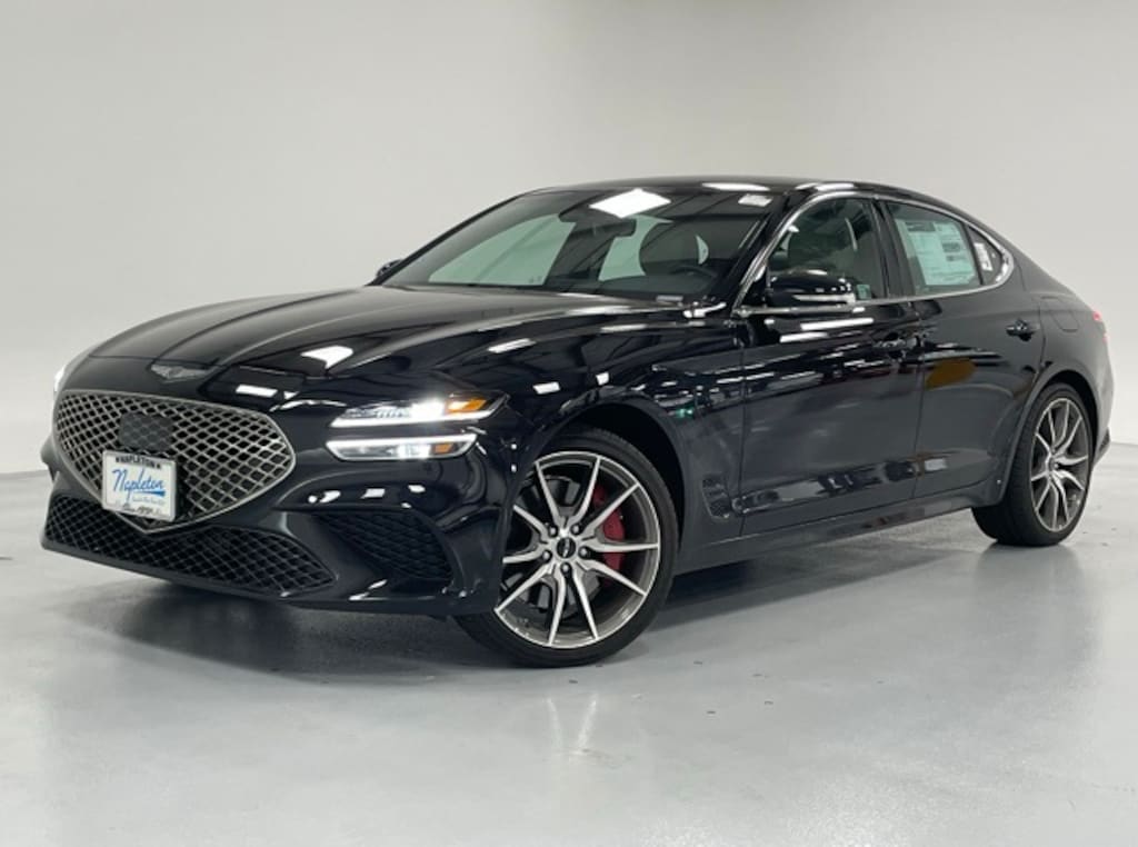This G70 is well equipped with Option Group 01, 4-Wheel Disc Brakes, 6 Speakers, ABS brakes, Air Conditioning, Alloy wheels, AM/FM radio: SiriusXM, Android Auto & Apple CarPlay, Anti-whiplash front head restraints, Auto High-beam Headlights, Auto-dimming Rear-View mirror, Automatic temperature control, Brake assist, Bumpers: body-color, Delay-off headlights, Driver door bin, Driver vanity mirror, Dual front impact airbags, Dual front side impact airbags, Electronic Stability Control, Emergency communication system: Genesis Connected Services, Exterior Parking Camera Rear, Four wheel independent suspension, Front anti-roll bar, Front Bucket Seats, Front Center Armrest, Front dual zone A/C, Front reading lights, Fully automatic headlights, Garage door transmitter: HomeLink, Heated door mirrors, Heated front seats, Heated Multi-Adjustable Front Bucket Seats, Heated steering wheel, Illuminated entry, Knee airbag, Leather steering wheel, Leatherette Seating Surfaces, Low tire pressure warning, Navigation System, Occupant sensing airbag, Outside temperature display, Overhead airbag, Overhead console, Panic alarm, Passenger door bin, Passenger vanity mirror, Power door mirrors, Power driver seat, Power passenger seat, Power steering, Power windows, Radio: AM/FM/SiriusXM/HD Audio System, Rear anti-roll bar, Rear reading lights, Rear seat center armrest, Rear side impact airbag, Rear window defroster, Remote keyless entry, Security system, Speed control, Speed-Sensitive Wipers, Split folding rear seat, Steering wheel mounted audio controls, Tachometer, Telescoping steering wheel, Traction control, Trip computer, Turn signal indicator mirrors, Variably intermittent wipers, and Wheels: 19" x 8.0J Fr & 19" x 8.5J Rr Alloy.