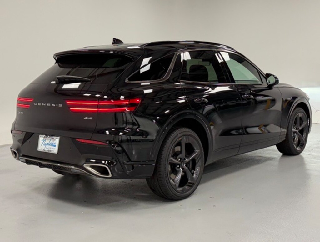 This GV70 is well equipped with Option Group 01, 16 Speakers, 4-Wheel Disc Brakes, ABS brakes, Air Conditioning, Alloy wheels, AM/FM radio: SiriusXM, Android Auto & Apple CarPlay, Anti-whiplash front head restraints, Auto High-beam Headlights, Auto-dimming door mirrors, Auto-dimming Rear-View mirror, Automatic temperature control, Brake assist, Bumpers: body-color, Cargo Net, Delay-off headlights, Driver door bin, Driver vanity mirror, Dual front impact airbags, Dual front side impact airbags, Electronic Stability Control, Emergency communication system: Genesis Connected Services, Exterior Parking Camera Rear, First Aid Kit, Four wheel independent suspension, Front anti-roll bar, Front Bucket Seats, Front Center Armrest w/Storage, Front dual zone A/C, Front reading lights, Fully automatic headlights, Garage door transmitter: HomeLink, Heated and Ventilated Front Bucket Seats, Heated door mirrors, Heated front seats, Heated steering wheel, Illuminated Door Scuff Plates, Illuminated entry, Knee airbag, Leather steering wheel, Low tire pressure warning, Memory seat, Navigation System, NFC Key Card, Occupant sensing airbag, Outside temperature display, Overhead airbag, Overhead console, Panic alarm, Passenger door bin, Passenger vanity mirror, Power door mirrors, Power driver seat, Power Liftgate, Power moonroof, Power passenger seat, Power steering, Power windows, Radio: 14.5" Navigation System with AM/FM/HD, Rain sensing wipers, Rear air conditioning, Rear anti-roll bar, Rear reading lights, Rear seat center armrest, Rear window defroster, Rear window wiper, Remote keyless entry, Security system, Speed control, Speed-sensing steering, Speed-Sensitive Wipers, Split folding rear seat, Spoiler, Sport Leather Seating Surfaces, Steering wheel memory, Steering wheel mounted audio controls, Tachometer, Telescoping steering wheel, Tilt steering wheel, Traction control, Trip computer, Turn signal indicator mirrors, Variably intermittent wipers, Ventilated front seats, and Wheels: 21" Dark Sputtering Alloy.