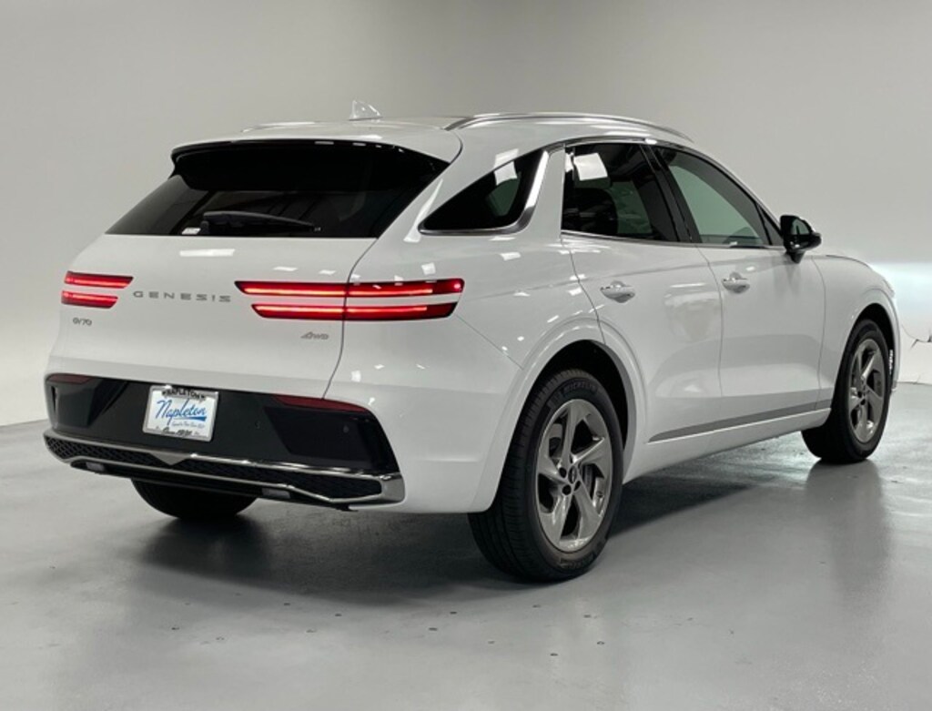This GV70 is well equipped with Option Group 01, 4-Wheel Disc Brakes, 9 Speakers, ABS brakes, Air Conditioning, Alloy wheels, AM/FM radio: SiriusXM, Android Auto & Apple CarPlay, Anti-whiplash front head restraints, Auto High-beam Headlights, Auto-dimming door mirrors, Auto-dimming Rear-View mirror, Automatic temperature control, Brake assist, Bumpers: body-color, Cargo Block, Cargo Cover, Cargo Net, Cargo Tray, Delay-off headlights, Driver door bin, Driver vanity mirror, Dual front impact airbags, Dual front side impact airbags, Electronic Stability Control, Emergency communication system: Genesis Connected Services, Exterior Parking Camera Rear, First Aid Kit, Four wheel independent suspension, Front anti-roll bar, Front Bucket Seats, Front Center Armrest w/Storage, Front dual zone A/C, Front reading lights, Fully automatic headlights, Garage door transmitter: HomeLink, Heated door mirrors, Heated Front Bucket Seats, Heated front seats, Illuminated entry, Knee airbag, Leather steering wheel, Leatherette Seating Surfaces, Low tire pressure warning, Memory seat, Navigation System, Occupant sensing airbag, Outside temperature display, Overhead airbag, Overhead console, Panic alarm, Passenger door bin, Passenger vanity mirror, Power door mirrors, Power driver seat, Power Liftgate, Power moonroof, Power passenger seat, Power steering, Power windows, Radio: 14.5" Navigation System w/AM/FM/HD Radio, Rain sensing wipers, Rear anti-roll bar, Rear reading lights, Rear seat center armrest, Rear window defroster, Rear window wiper, Remote keyless entry, Security system, Speed control, Speed-sensing steering, Speed-Sensitive Wipers, Split folding rear seat, Spoiler, Steering wheel memory, Steering wheel mounted audio controls, Tachometer, Telescoping steering wheel, Tilt steering wheel, Traction control, Trip computer, Turn signal indicator mirrors, Variably intermittent wipers, and Wheels: 19" Light Hyper Silver Alloy.