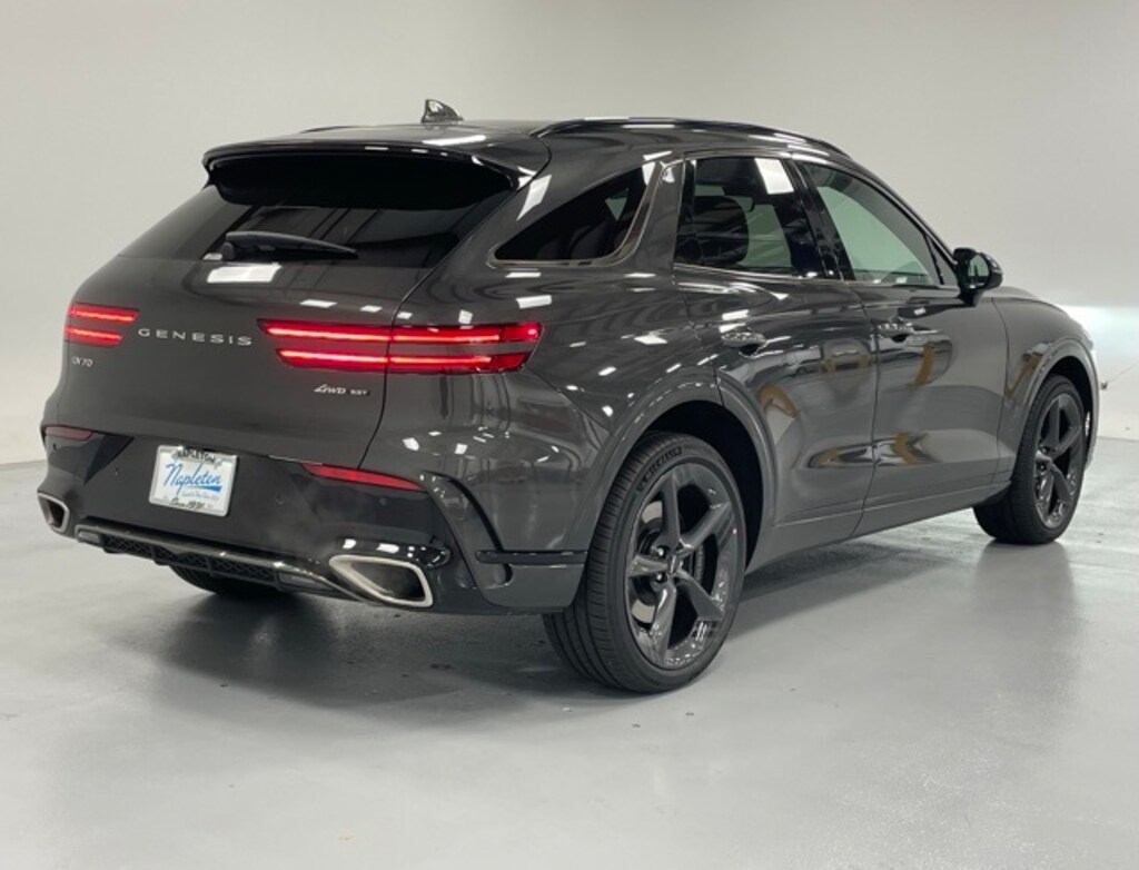 This GV70 is well equipped with Option Group 01, 16 Speakers, 4-Wheel Disc Brakes, ABS brakes, Adaptive suspension, Air Conditioning, Alloy wheels, AM/FM radio: SiriusXM, Android Auto & Apple CarPlay, Anti-whiplash front head restraints, Auto High-beam Headlights, Auto-dimming door mirrors, Auto-dimming Rear-View mirror, Automatic temperature control, Brake assist, Bumpers: body-color, Cargo Block, Cargo Cover, Cargo Net, Cargo Tray, Delay-off headlights, Driver door bin, Driver vanity mirror, Dual front impact airbags, Dual front side impact airbags, Electronic Stability Control, Emergency communication system: Genesis Connected Services, Exterior Parking Camera Rear, First Aid Kit, Four wheel independent suspension, Front anti-roll bar, Front Bucket Seats, Front Center Armrest w/Storage, Front dual zone A/C, Front reading lights, Fully automatic headlights, Garage door transmitter: HomeLink, Heads-Up Display, Heated and Ventilated Front Bucket Seats, Heated door mirrors, Heated front seats, Heated rear seats, Heated steering wheel, Illuminated entry, Knee airbag, Leather steering wheel, Low tire pressure warning, Memory seat, Nappa Leather Seating Surfaces, Navigation System, NFC Key Card, Occupant sensing airbag, Outside temperature display, Overhead airbag, Overhead console, Panic alarm, Passenger door bin, Passenger vanity mirror, Power door mirrors, Power driver seat, Power Liftgate, Power moonroof, Power passenger seat, Power steering, Power windows, Radio: 14.5" Navigation System with AM/FM/HD, Rain sensing wipers, Rear air conditioning, Rear anti-roll bar, Rear reading lights, Rear seat center armrest, Rear window defroster, Rear window wiper, Remote keyless entry, Security system, Speed control, Speed-sensing steering, Speed-Sensitive Wipers, Split folding rear seat, Spoiler, Steering wheel memory, Steering wheel mounted audio controls, Tachometer, Telescoping steering wheel, Tilt steering wheel, Traction control, Trip computer, Turn signal indicator mirrors, Variably intermittent wipers, Ventilated front seats, and Wheels: 21" Dark Sputtering Alloy.