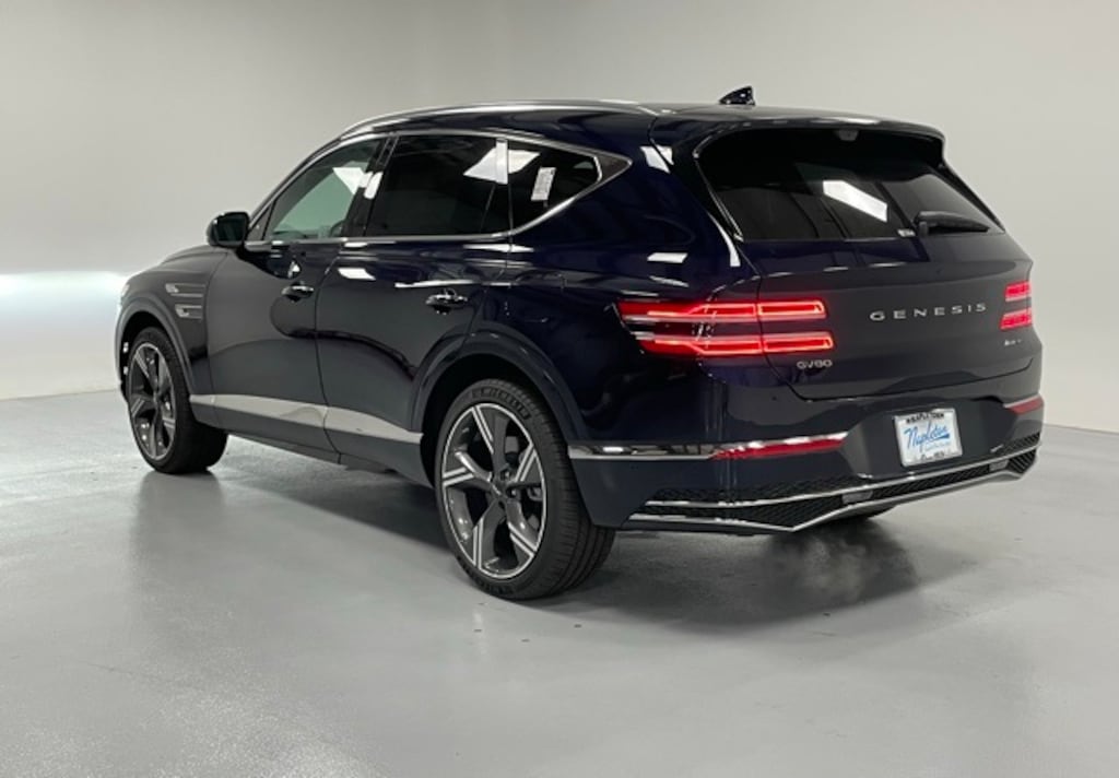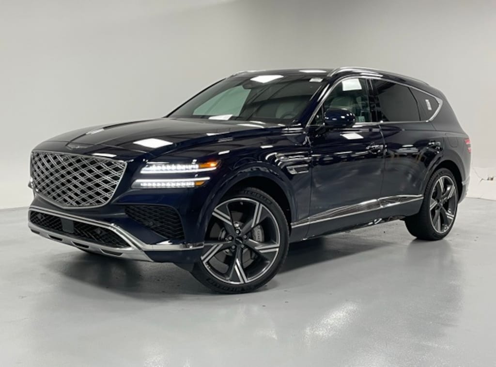 This GV80 is well equipped with Option Group 01, 18 Speakers, 3rd row seats: split-bench, 4-Wheel Disc Brakes, ABS brakes, Adaptive suspension, Air Conditioning, Alloy wheels, AM/FM radio: SiriusXM, Anti-whiplash front head restraints, Auto High-beam Headlights, Auto tilt-away steering wheel, Auto-dimming door mirrors, Auto-dimming Rear-View mirror, Automatic temperature control, Brake assist, Bumper Applique, Bumpers: body-color, Compass, Delay-off headlights, Driver door bin, Driver vanity mirror, Dual front impact airbags, Dual front side impact airbags, Electronic Stability Control, Emergency communication system: Genesis Connected Services, Exterior Parking Camera Rear, Four wheel independent suspension, Front anti-roll bar, Front Bucket Seats, Front Center Armrest, Front dual zone A/C, Front reading lights, Fully automatic headlights, Garage door transmitter: HomeLink, Genuine wood console insert, Genuine wood dashboard insert, Genuine wood door panel insert, Heads-Up Display, Heated & Ventilated Front Bucket Seats, Heated door mirrors, Heated front seats, Heated rear seats, Heated steering wheel, Illuminated entry, Knee airbag, Leather steering wheel, Low tire pressure warning, Memory seat, Nappa Leather Seating Surfaces, Navigation System, NFC Key Card, Occupant sensing airbag, Outside temperature display, Overhead airbag, Overhead console, Panic alarm, Passenger door bin, Passenger vanity mirror, Power door mirrors, Power driver seat, Power Liftgate, Power moonroof, Power passenger seat, Power steering, Power windows, Radio data system, Radio: AM/FM/SiriusXM/HD Bang & Olufsen Sound Sys, Rain sensing wipers, Rear air conditioning, Rear anti-roll bar, Rear reading lights, Rear seat center armrest, Rear side impact airbag, Rear window defroster, Rear window wiper, Reclining 3rd row seat, Remote keyless entry, Roadside Assistance Kit, Roof Rack Cross Bars, Security system, Speed control, Speed-sensing steering, Speed-Sensitive Wipers, Split folding rear seat, Spoiler, Steering wheel memory, Steering wheel mounted audio controls, Tachometer, Telescoping steering wheel, Tilt steering wheel, Traction control, Trip computer, Turn signal indicator mirrors, Variably intermittent wipers, Ventilated front seats, Ventilated rear seats, and Wheels: 22" x 9.5J Dark Gray Matte Alloy.