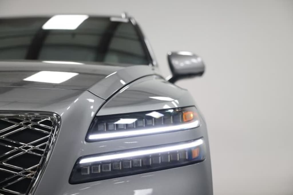 This GV80 is well equipped with Option Group 01, 18 Speakers, 3rd row seats: split-bench, 4-Wheel Disc Brakes, ABS brakes, Adaptive suspension, Air Conditioning, Alloy wheels, AM/FM radio: SiriusXM, Anti-whiplash front head restraints, Auto High-beam Headlights, Auto tilt-away steering wheel, Auto-dimming door mirrors, Auto-dimming Rear-View mirror, Automatic temperature control, Brake assist, Bumpers: body-color, Cargo Net, Compass, Delay-off headlights, Driver door bin, Driver vanity mirror, Dual front impact airbags, Dual front side impact airbags, Electronic Stability Control, Emergency communication system: Genesis Connected Services, Exterior Parking Camera Rear, First Aid Kit, Floating Wheel Cap, Four wheel independent suspension, Fragrance Cartridge, Front and Rear Mudguards, Front anti-roll bar, Front Bucket Seats, Front Center Armrest, Front dual zone A/C, Front reading lights, Fully automatic headlights, Garage door transmitter: HomeLink, Genuine wood console insert, Genuine wood dashboard insert, Genuine wood door panel insert, Heads-Up Display, Heated and Ventilated Front Bucket Seats, Heated door mirrors, Heated front seats, Heated rear seats, Heated steering wheel, Illuminated Door Scuff Plates, Illuminated entry, Knee airbag, Leather steering wheel, Low tire pressure warning, Memory seat, Nappa Leather Seating Surfaces, Navigation System, NFC Key Card, Occupant sensing airbag, Outside temperature display, Overhead airbag, Overhead console, Panic alarm, Passenger door bin, Passenger vanity mirror, Power door mirrors, Power driver seat, Power Liftgate, Power moonroof, Power passenger seat, Power steering, Power windows, Radio data system, Radio: AM/FM/HD Bose Premium Sound System, Rain sensing wipers, Rear air conditioning, Rear anti-roll bar, Rear reading lights, Rear seat center armrest, Rear side impact airbag, Rear window defroster, Rear window wiper, Reclining 3rd row seat, Remote keyless entry, Security system, Speed control, Speed-sensing steering, Speed-Sensitive Wipers, Split folding rear seat, Spoiler, Steering wheel memory, Steering wheel mounted audio controls, Tachometer, Telescoping steering wheel, Tilt steering wheel, Traction control, Trip computer, Turn signal indicator mirrors, Variably intermittent wipers, Ventilated front seats, Ventilated rear seats, and Wheels: 22" x 9.5J Dark Gray Matte Alloy.