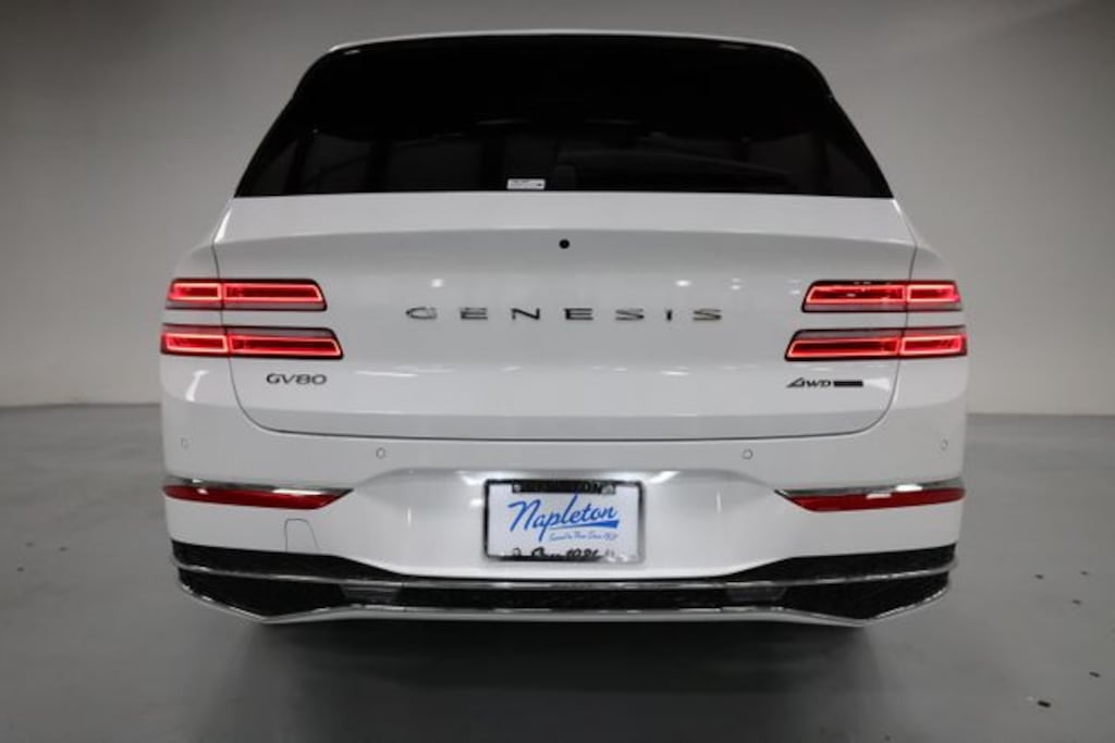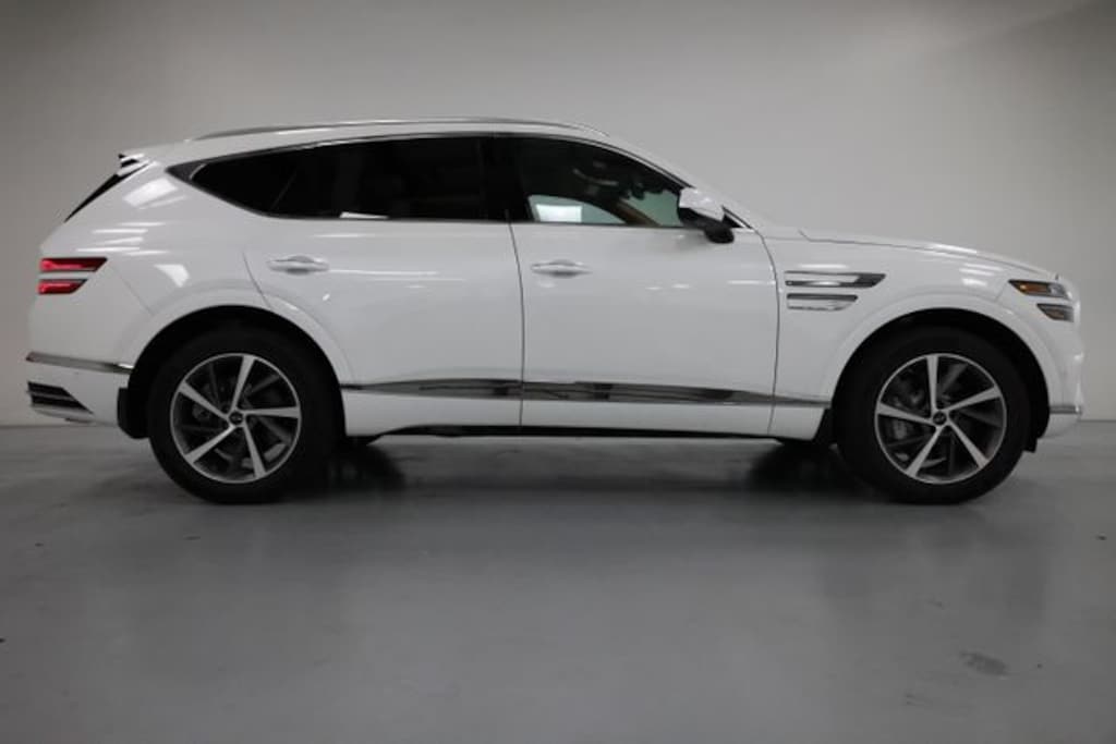 This GV80 is well equipped with Option Group 01, 18 Speakers, 3rd row seats: split-bench, 4-Wheel Disc Brakes, ABS brakes, Adaptive suspension, Air Conditioning, Alloy wheels, AM/FM radio: SiriusXM, Anti-whiplash front head restraints, Auto High-beam Headlights, Auto tilt-away steering wheel, Auto-dimming door mirrors, Auto-dimming Rear-View mirror, Automatic temperature control, Brake assist, Bumpers: body-color, Cargo Net, Compass, Delay-off headlights, Driver door bin, Driver vanity mirror, Dual front impact airbags, Dual front side impact airbags, Electronic Stability Control, Emergency communication system: Genesis Connected Services, Exterior Parking Camera Rear, First Aid Kit, Four wheel independent suspension, Fragrance Cartridge, Front and Rear Mudguards, Front anti-roll bar, Front Bucket Seats, Front Center Armrest, Front dual zone A/C, Front reading lights, Fully automatic headlights, Garage door transmitter: HomeLink, Genuine wood console insert, Genuine wood dashboard insert, Genuine wood door panel insert, Heads-Up Display, Heated and Ventilated Front Bucket Seats, Heated door mirrors, Heated front seats, Heated rear seats, Heated steering wheel, Illuminated entry, Knee airbag, Leather Seating Surfaces, Leather steering wheel, Low tire pressure warning, Memory seat, Navigation System, NFC Key Card, Occupant sensing airbag, Outside temperature display, Overhead airbag, Overhead console, Panic alarm, Passenger door bin, Passenger vanity mirror, Power door mirrors, Power driver seat, Power Liftgate, Power moonroof, Power passenger seat, Power steering, Power windows, Radio data system, Radio: AM/FM/HD Bose Premium Sound System, Rain sensing wipers, Rear air conditioning, Rear anti-roll bar, Rear reading lights, Rear seat center armrest, Rear side impact airbag, Rear window defroster, Rear window wiper, Reclining 3rd row seat, Remote keyless entry, Roadside Assistance Kit, Security system, Speed control, Speed-sensing steering, Speed-Sensitive Wipers, Split folding rear seat, Spoiler, Steering wheel memory, Steering wheel mounted audio controls, Tachometer, Telescoping steering wheel, Tilt steering wheel, Traction control, Trip computer, Turn signal indicator mirrors, Variably intermittent wipers, Ventilated front seats, and Wheels: 20" x 8.5J Dark Gray Matte Alloy.